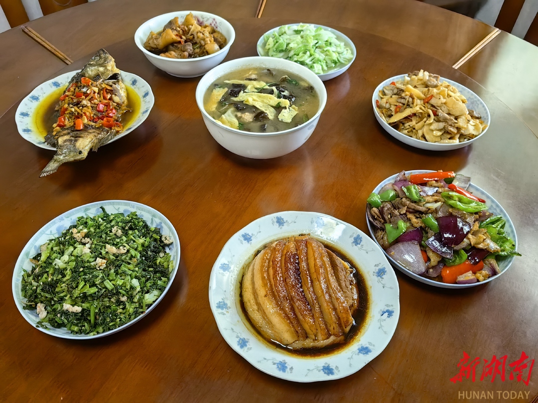 摘菜、洗菜、切菜、生火、做菜……一个多小时后,张立华和丈夫做了满满一桌菜,有梅菜扣肉、烟笋炒腊肉、红烧鲫鱼、红烧猪蹄、清炒时蔬等7道菜。
