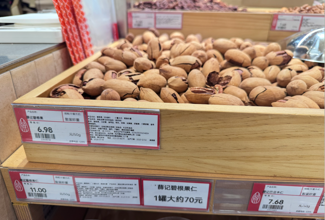 这样的价格,让不少消费者直观地感觉到“不便宜”。以日常食材作为参照,目前长沙市场猪肉均价约13元/斤,牛肉约40元/斤。一斤商场原味瓜子约等于两斤猪肉,而一斤精品坚果的价格则相当于六斤猪肉或两斤多牛肉。当炒货单价显著高于肉价时,其“精品零食”的定位便愈发清晰。