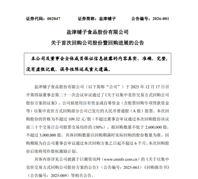 日前,盐津铺子完成近期回购计划的首次回购,首次回购使用资金2212万余元。公司表示,回购是基于对长期内在价值的坚定信心,也为建立长效激励机制,充分调动管理人员和核心技术人员的积极性。