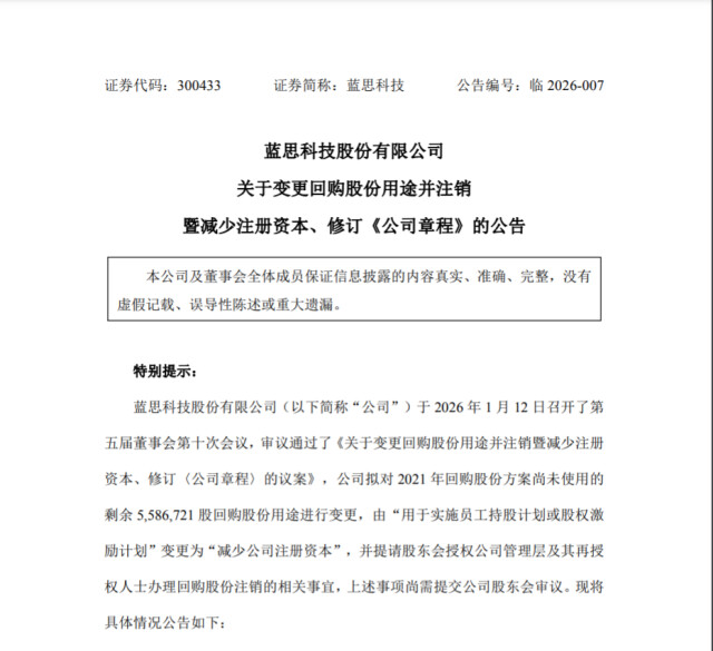 蓝思科技近日发布公告,公司计划将2021年回购方案中尚未使用的剩余558余万股股份,由原定“用于实施员工持股计划或股权激励计划”的用途,变更为“用于减少公司注册资本”,并予以注销。