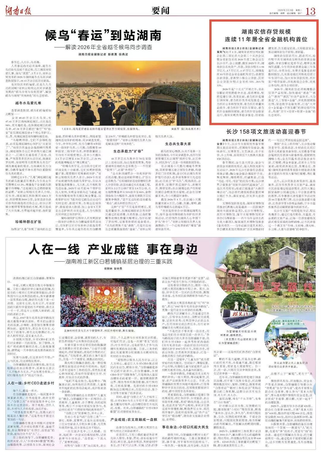 华声在线2月2日讯(全媒体记者 黄利飞)2月1日,湖南省农村信用社联合社第二届社员大会第二十五次会议暨全省农信系统2026年度工作会议在长沙召开。会上披露,截至2025年末,湖南农信系统资产、存款、贷款分别为1.98万亿元、1.7万亿元、1.17万亿元,规模连续11年排名全省金融机构首位;普惠型涉农贷款、普惠型小微企业贷款、民营企业贷款分别占全省的33%、26%和33%。