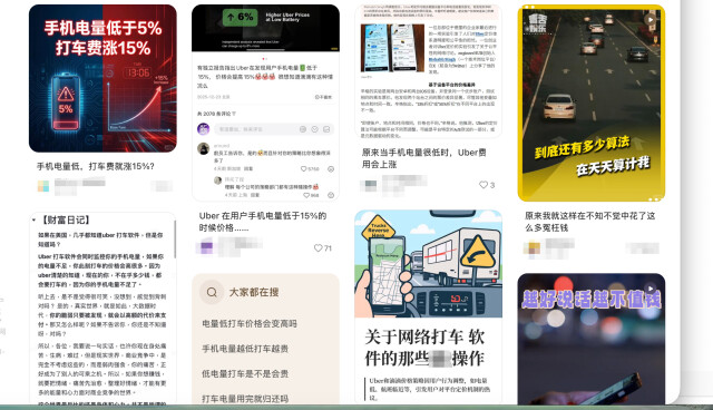 在网约车领域也有此现象。有国外网友分享,Uber打车平台似乎会根据用户手机电量收取不同价格。定价逻辑显而易见:手机快没电的用户“等不起”,只能接受高价。