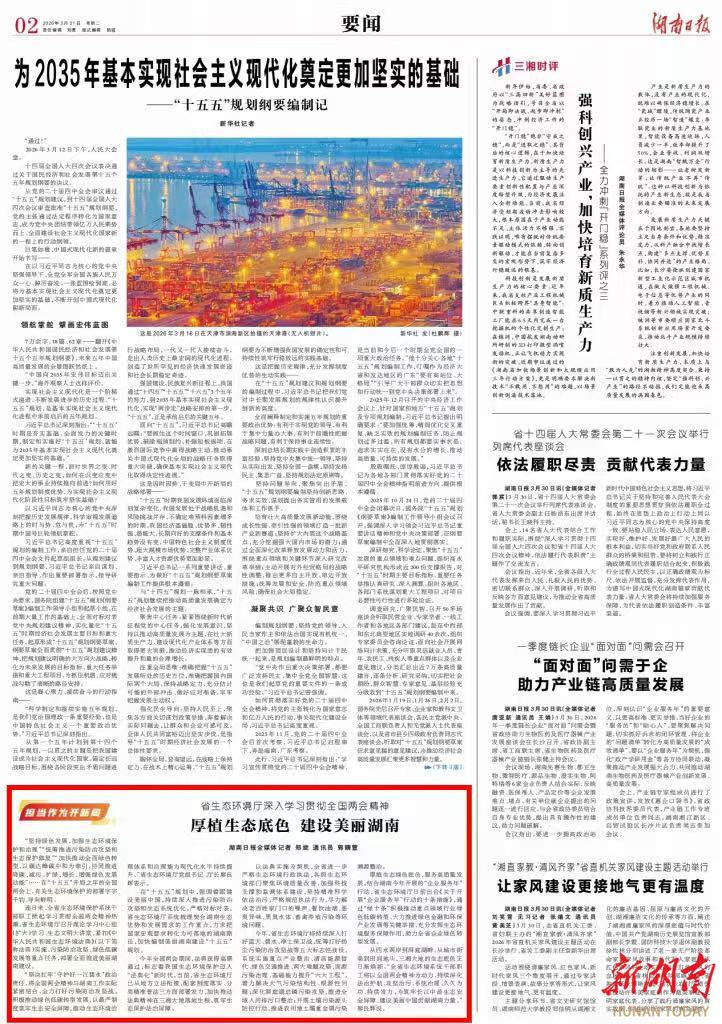 今年全国两会反复强调保护改善生态环境。在“十五五”规划中,强调着眼建设美丽中国,持续深入推进污染防治攻坚和生态系统优化。严格对标对表,省生态环境厅系统梳理契合湖南生态优势和发展需求的工作重点,力求把国家宏观要求转化为可落地的湖南路径,加快编制美丽湖南建设“十五五”规划。