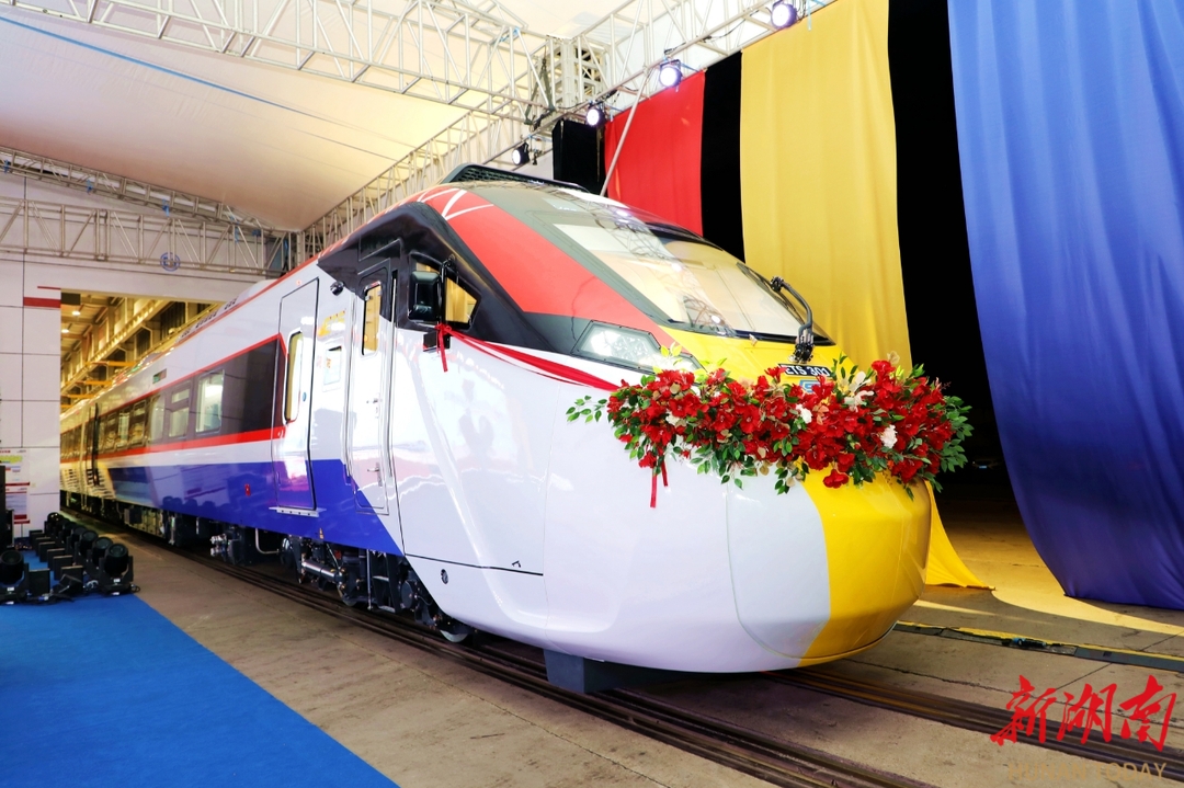 2024年6月7日,由中车株机公司研制的马来西亚ETS3新型米轨动车组在株洲下线,将运用在马来西亚全长约950公里西海岸线上。省商务厅供图