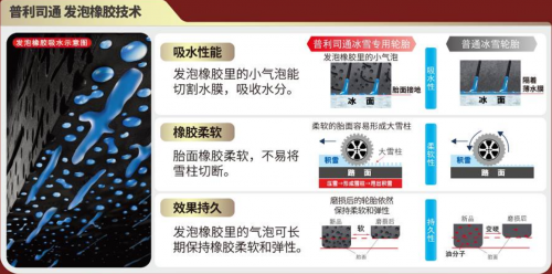 普利司通在轮胎技术研发上拥有丰富经验,冰锐客BLIZZAK系列雪地胎所采用的发泡橡胶技术为冬季出行安全提供了强大保障,是为北方冬季路况量身打造。发泡橡胶里的小气泡能够切割水膜,吸收水分,有效防止轮胎在路面上打滑,从而大大增强轮胎在冰面上的抓地力。而且胎面橡胶柔软,更容易形成大雪柱,增加积雪路面抓地力。更为重要的是,发泡橡胶里的气泡可长期保持橡胶柔软和弹性,即使轮胎磨损后,依然性能良好,为冰雪路面出行持续保驾护航。