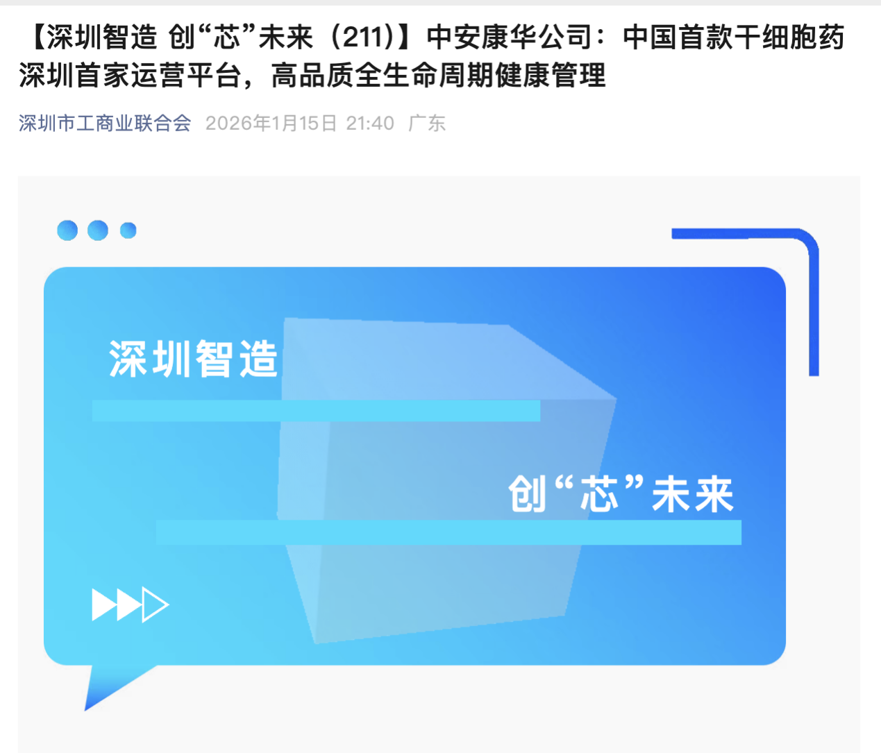 近日, 中安康华医疗健康产业集团获深圳市工商业联合会(总商会)微信公众号《深圳智造 创“芯”未来》专栏推介, 高度认可集团在高端健康管理领域的专业积淀、技术创新与行业价值。