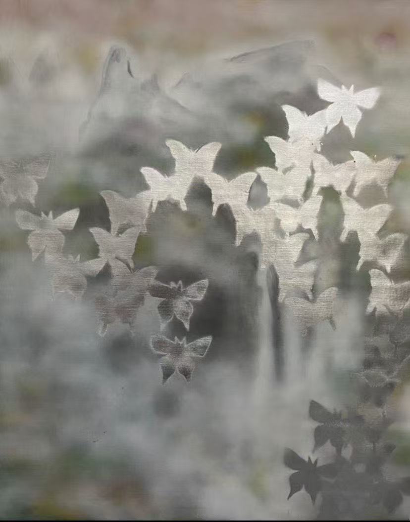 蝴蝶妈妈的神性,在陈顺林笔下幻化为“银蝶”的灵动姿态——既是苗族人信仰中创生万物的始祖,亦是艺术家心象中地域人文精神的聚焦。水墨的虚实相生与油画的层层堆积的张力,构建出“心物合一”的图像体系,银蝶从瀑布实景中幻化而出,呼应“无中生有”的创作哲学。