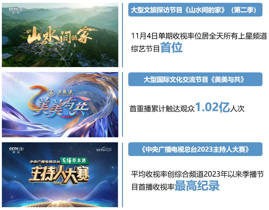 10月以来,综合频道晚间黄金时段重磅推出了一系列亮眼的口碑之作。11月4日,由鲁花独家冠名的大型文旅探访节目《山水间的家》(第二季)收视率达0.88%;10月5日起,由五粮液独家冠名的大型国际文化交流节目《美美与共》播出,全景式讲述共建“一带一路”倡议下文明互鉴、开放合作、多元文化交流碰撞的故事,首重播累计触达观众1.02亿人次;11月5日,由毛铺草本酒独家冠名的《中央广播电视总台2023主持人大赛》第4期节目收视率达0.91%。