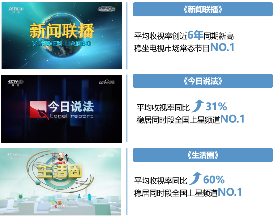 10月以来,综合频道常态节目收视也取得了不俗的成绩。黄金时段《新闻联播》平均收视率稳居电视市场常态节目第一名,创近6年来同期新高;《焦点访谈》栏目平均收视率创近8年来同期新高;《今日说法》平均收视率创近7年来同期新高,同比提升31%,稳居同时段全国上星频道第一;《生活圈》平均收视率创播出以来同期新高,同比提升60%;《正大综艺》平均收视率创近6年来同期新高,同比提升71%;《第一动画乐园》平均收视率创近6年来同期新高,同比提升79%。
