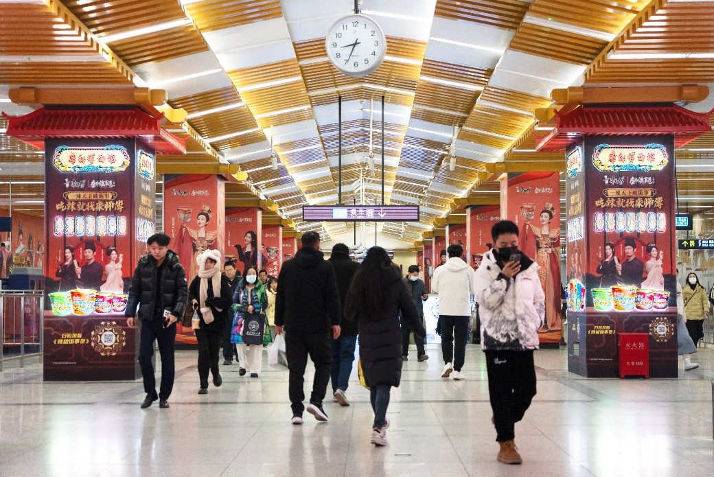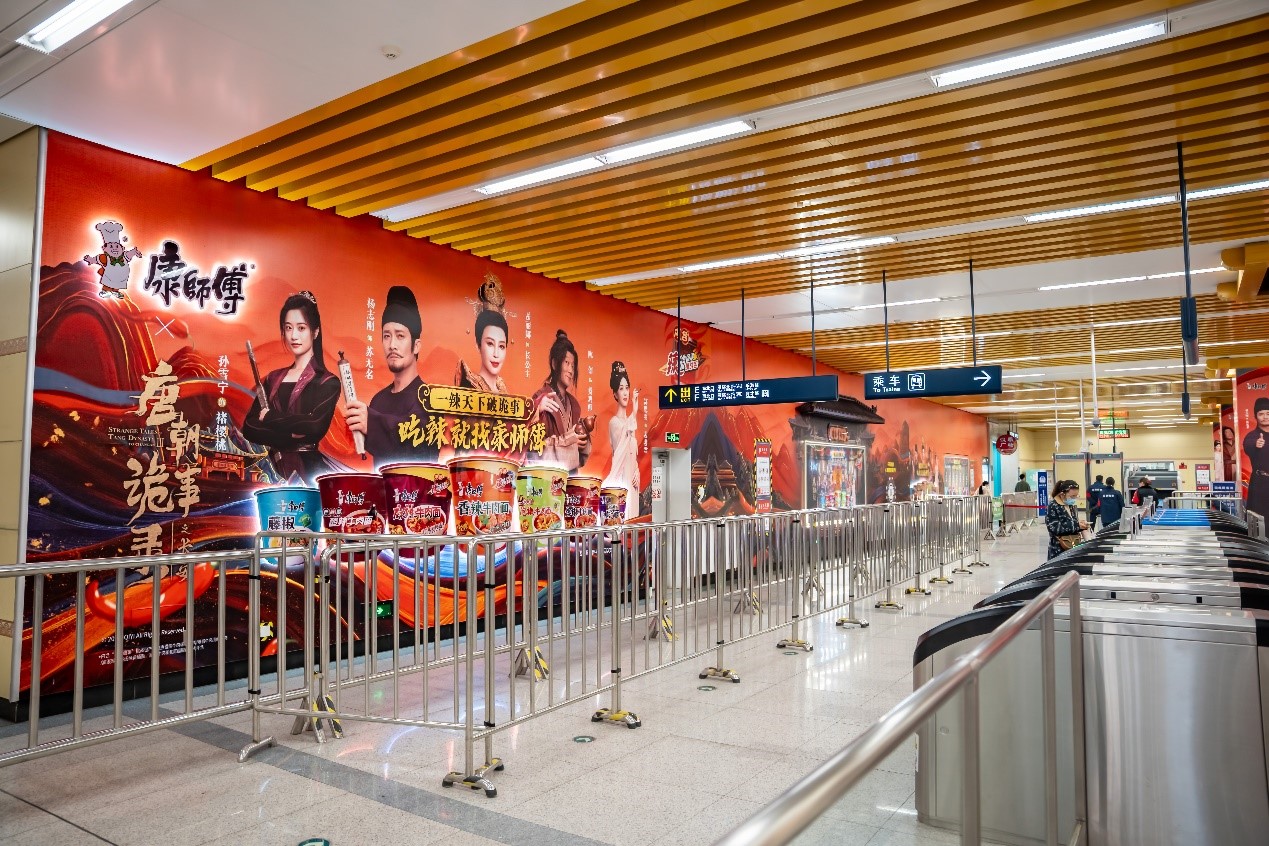 •线下场景复刻:在西安地铁大雁塔站打造“康师傅面馆”主题站厅,借助唐风文化地标大唐不夜城与地铁高频客流,将品牌场景转化为可触达的文化打卡点,实现沉浸式“内容即体验”的传播升维。