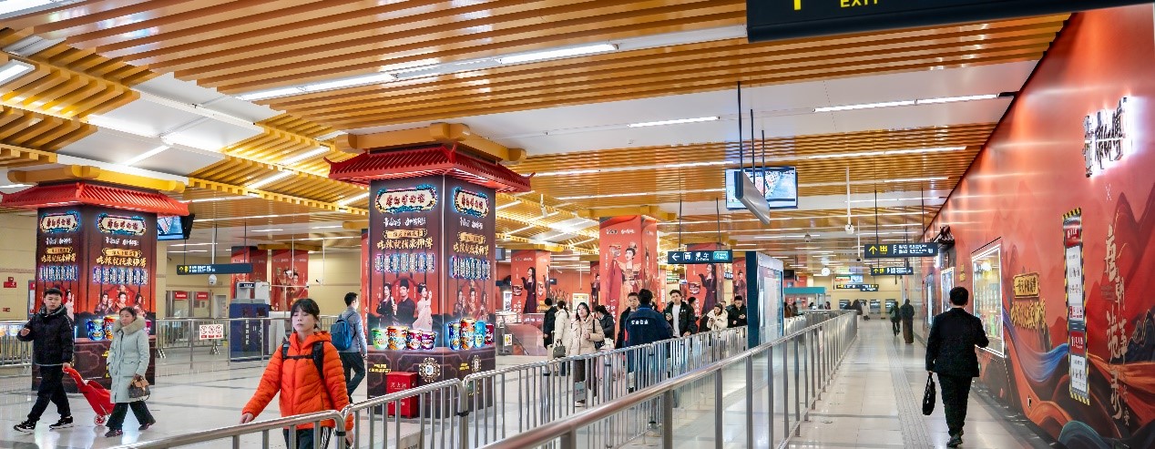 •空间叙事化:覆盖大雁塔站站厅,构建与辣破诡事IP结合的视觉动线,让乘客在通行过程中自然沉浸于品牌营造的文化氛围中。