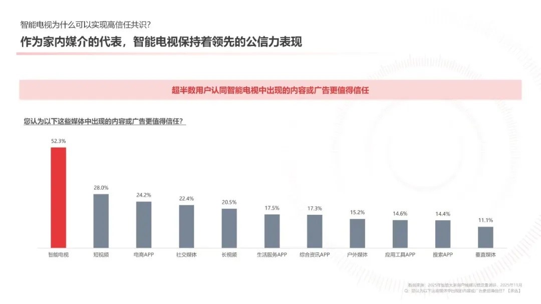 行业报告往往会显示OTT广告预算在OTT(设备系统)和APK(电视App)间的分配似乎相近,其实这很容易造成二者是平行选择的误判。所谓APK过亿的月活,大多包含SDK内置服务的用户。只看独立APK的日活跃用户(DAU),规模就会急剧收缩——主流视频平台在大屏端的日活仅百万量级,加起来可能都不及头部终端阵营活跃用户的十分之一。因此,在大屏端单独投放某个内容APK的触达效率可能很低而且波动会很大,与头部终端合作,品牌实际上是购买了通往亿级家庭客厅的“高速公路”优先通行权。