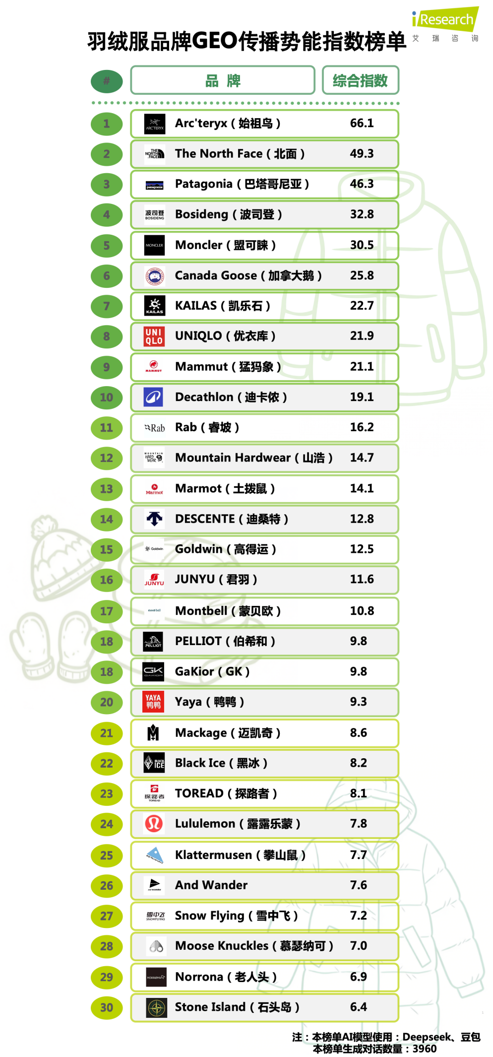 导语:艾瑞咨询首发《羽绒服品牌GEO传播势能指数榜单》,所有指数均通过AI定向提问测算,榜单筛选出30个表现突出的主流羽绒服品牌。