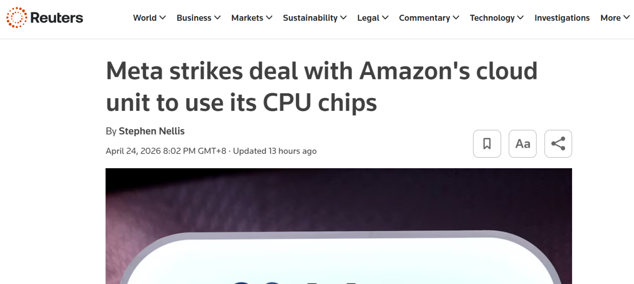 导语:4月25日消息,据路透社报道,Meta 与亚马逊 AWS 近日正式达成合作协议,双方将基于 AWS Graviton 处理器共同构建下一代人工智能基础设施,为 AI 技术创新与规模化应用提供坚实算力支撑。